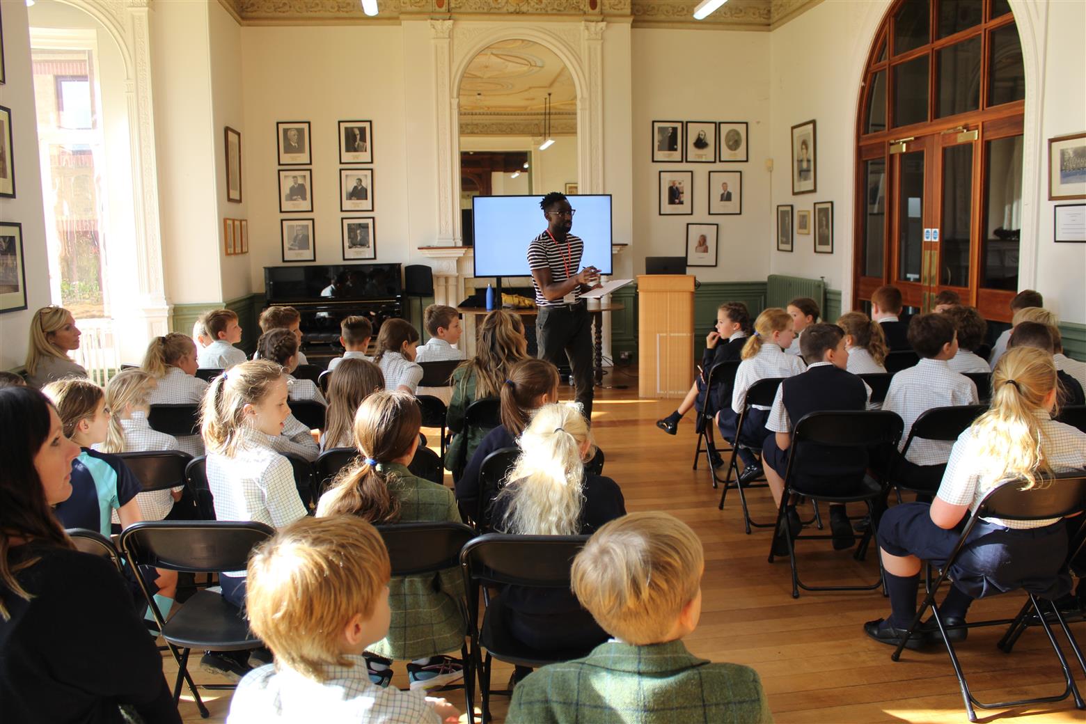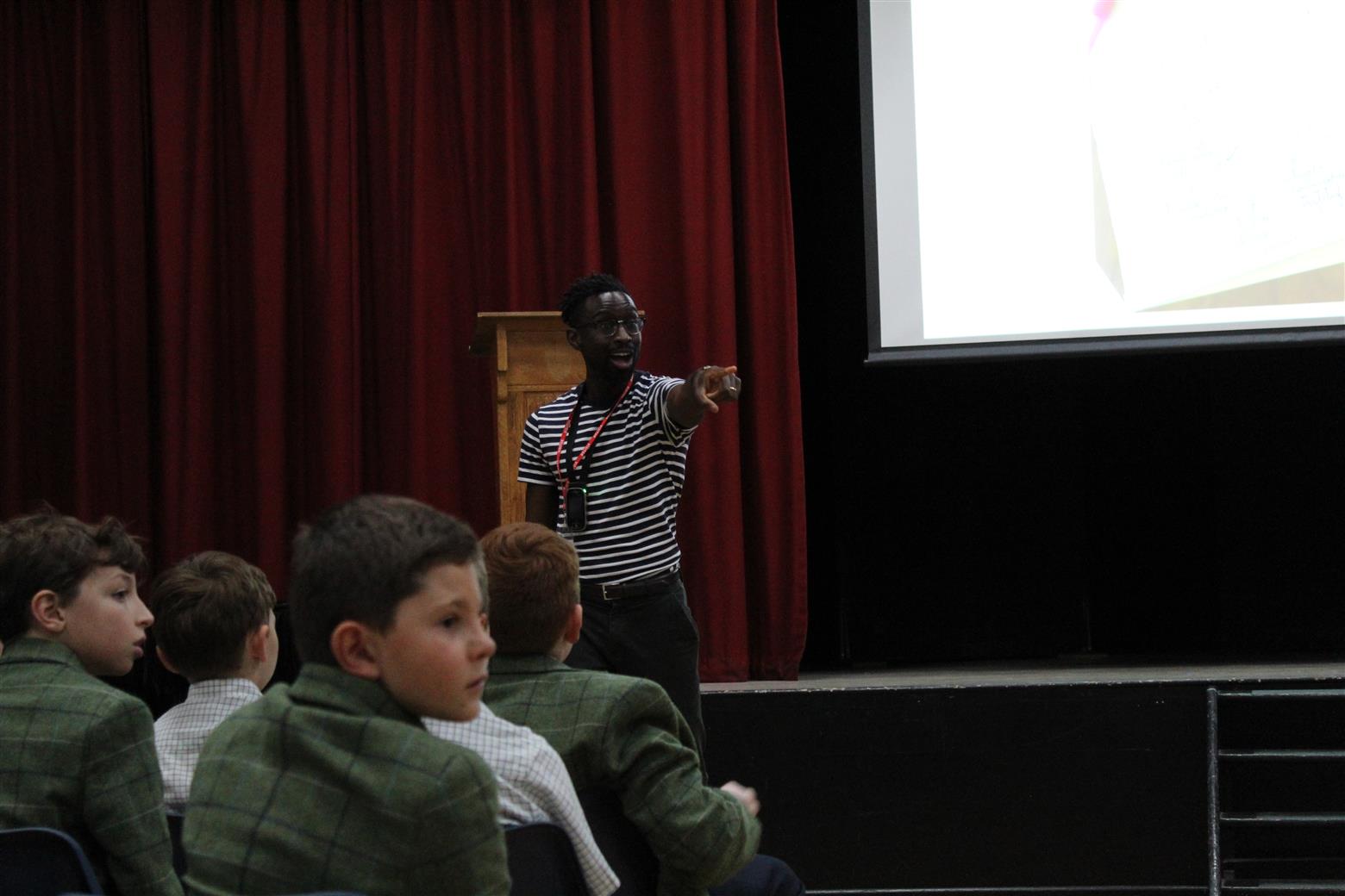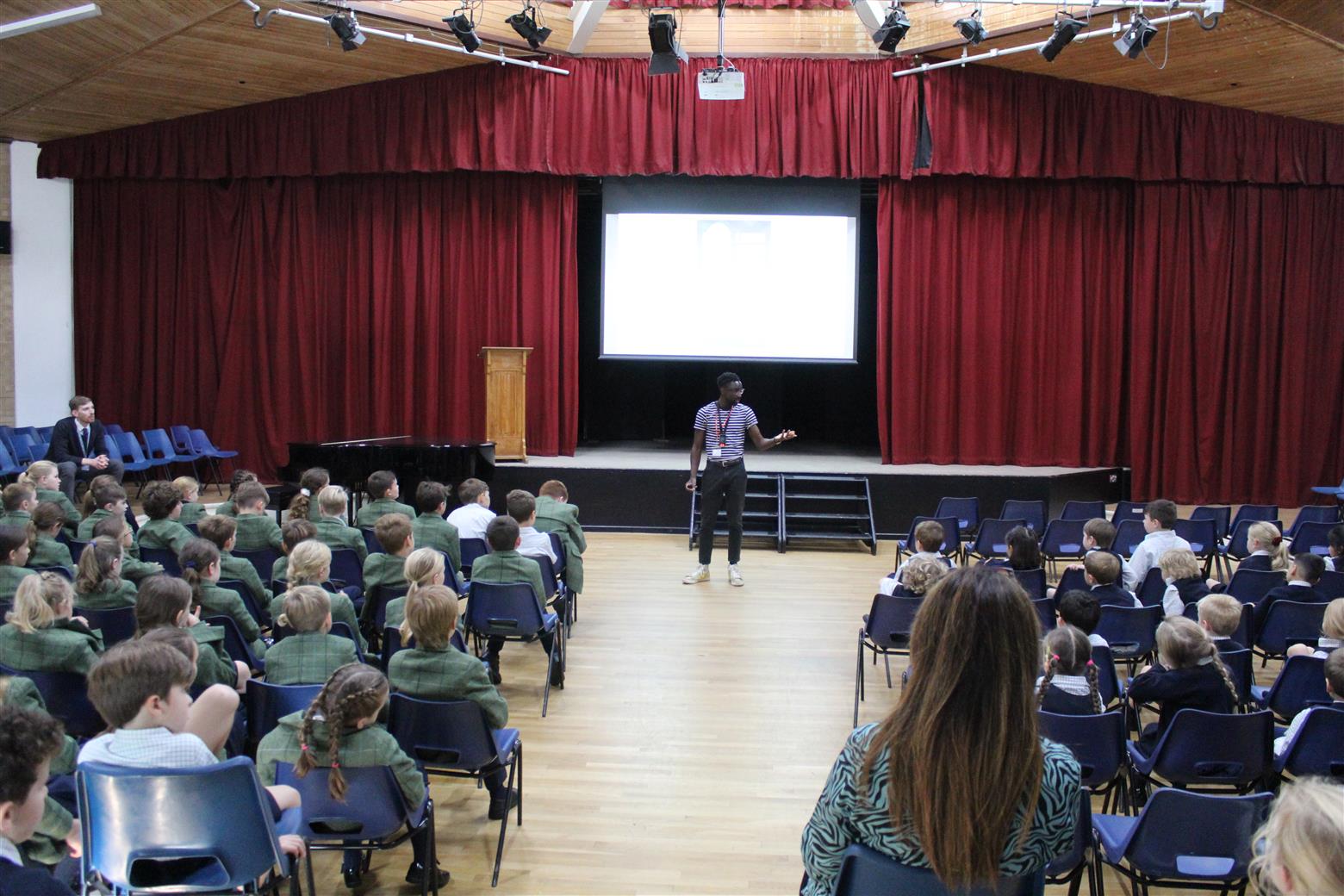 Jeffrey's visit started with a tour of the Senior School with A Level English Literature students, Phoebe and Millie who enjoyed asking him lots of questions. He then presented at both Senior and Prep assemblies followed by two workshops for Year 7 and Years 5 and 6.